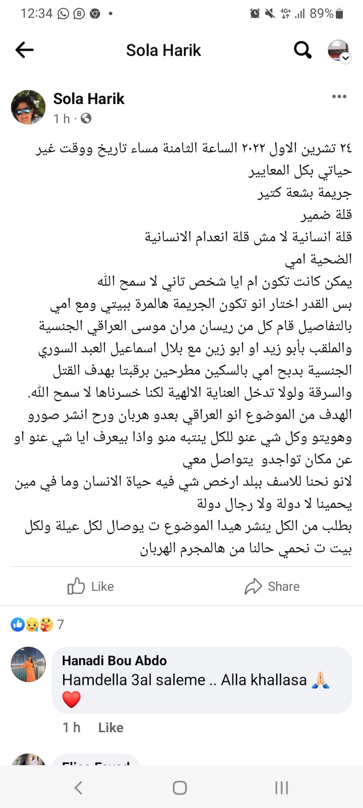 سولا حريق: هذه المرة الجريمة في بيتي والضحية هي أمي