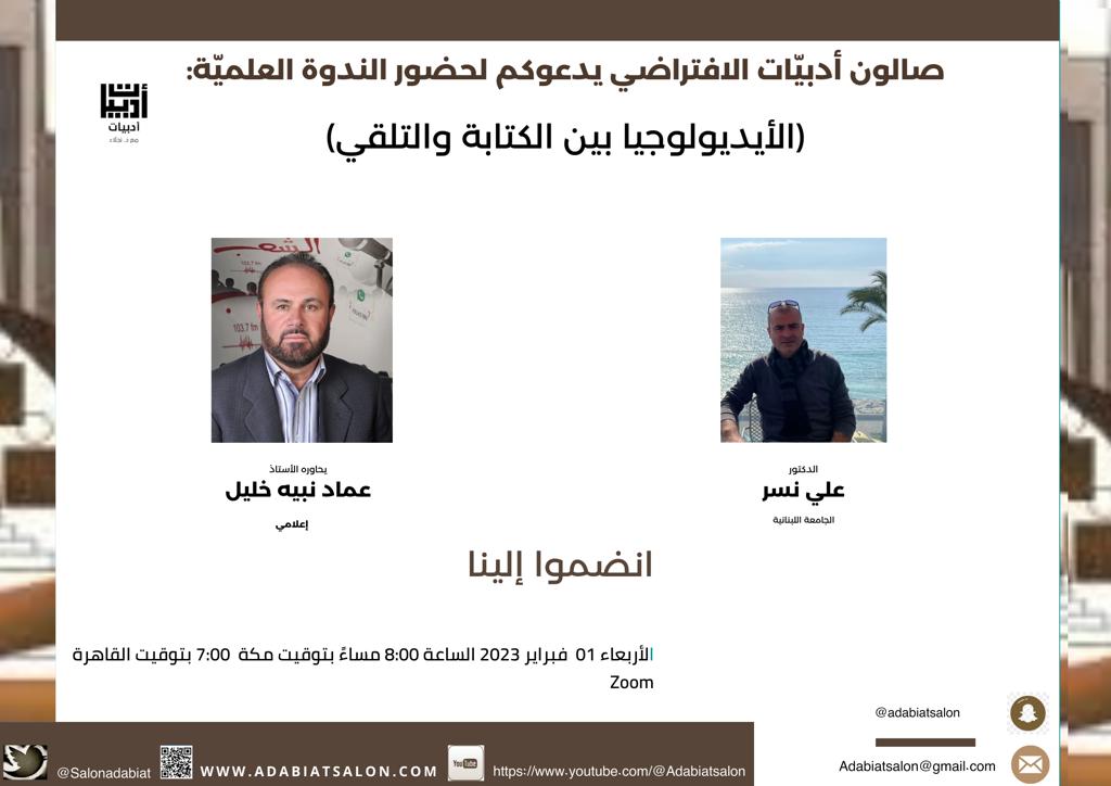 قناة صالون أدبيات الافتراضي تبث ندوة بعنوان: صحيح الأيديولوجيا بين الكتابة والتلقي مع د.علي نسر