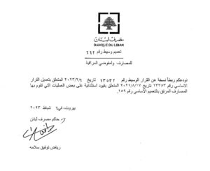 صدر عن مصرف لبنان تعميمٌ, متعلّق بتعديل القرار الأساسي رقم 13353 الذي يتعلّق بقيود استثنائية على بعض العمليات التي تقوم بها المصارف المرفق بالتعميم الأساسي رقم 159.