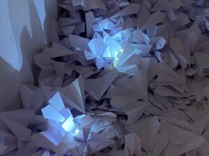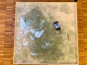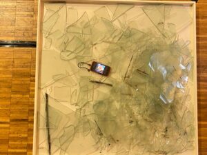 ولدت تركيبات الفنانة التشكيلية، التي تجمع بين الزجاج المكسور والورق المطوي والممزق والفيديو والوثائق الصوتية، في أعقاب هذه المأساة الأخيرة والمآسي المتتالية في لبنان.