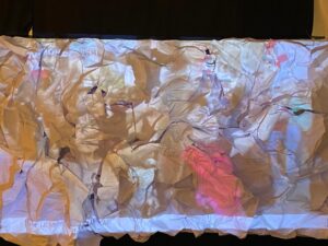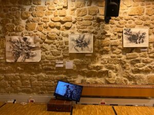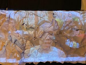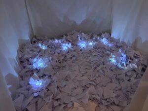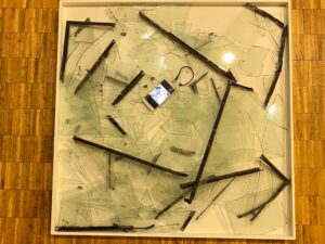 “إنشاء التركيبة الصامتة” في معرض “بيروت 6 مساءً” للفنانة نواده ديلابيير، وهي فنانة شابة توحد الفنون البصرية والرقص في عملها. إذ تعتبر أن الصمت ضروري لالتقاط الأنفاس في وجه عنف الموقف، وللتمكن من الجمع والغوص في النفس من أجل العثور على الطاقة اللازمة للنهوض. آني سوريت – مؤرخة فنية و محاضرة في معهد IMA
