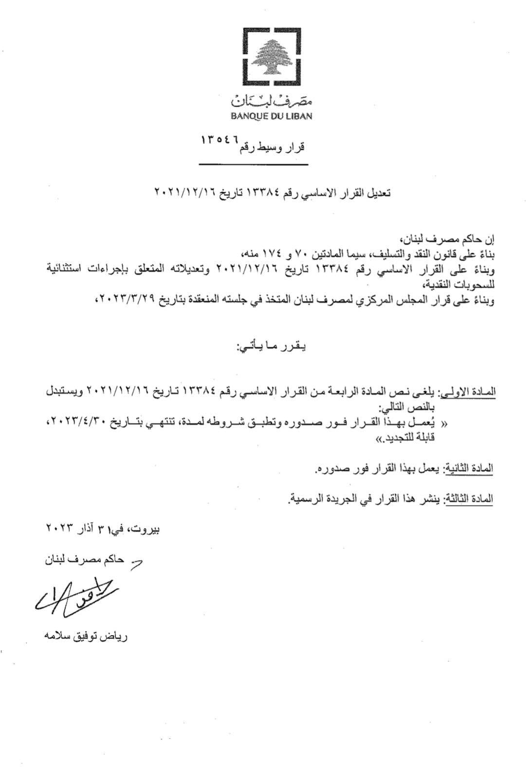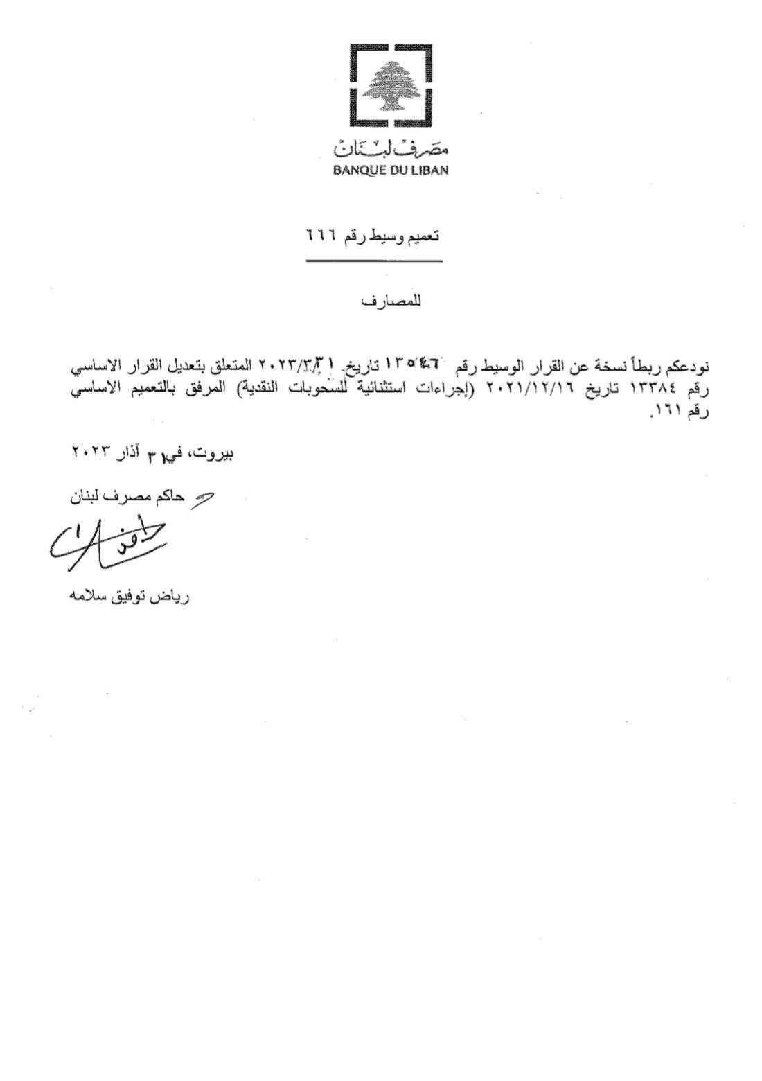 صدر عن مصرف لبنان تعميم وسيط يتعلّق بالإجراءات الاستثنائية للسحوبات النقديّة، وتجديد العمل بالتعميم 161.