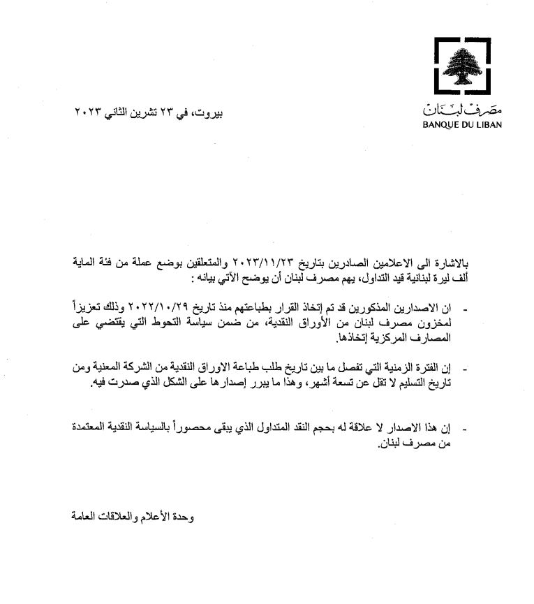 أصدر مصرف لبنان بياناً، بشأن وضع عملة من فئة 100 ألف ليرة قيد التداول، وقد جاء فيه: