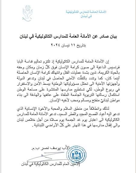 بناء على البيان الصادر عن الأمانة العامة للمدارس الكاثوليكية تقفل المدرسة أبوابها غدا الجمعة الواقع فيه ١٢ نيسان ٢٠٢٤