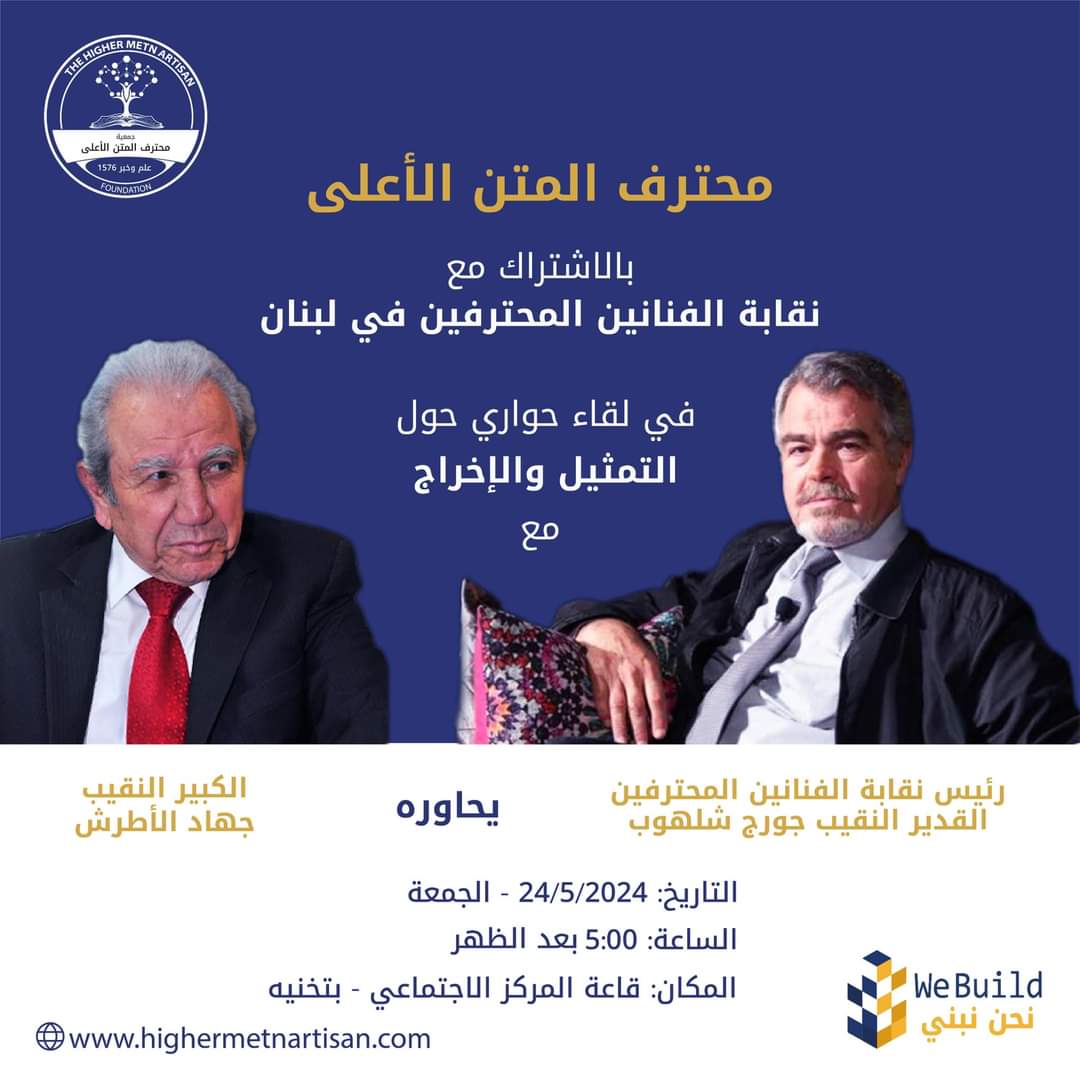 كتبت جمعية محترف المتن الاعلى : العد التنازلي بدأ! أسبوع يفصلنا عن هذا اللقاء الحواري المميز الذي يجمع بين النقيبين القديرين جورج شلهوب يحاوره الكبير جهاد الاطرش حول تجربته الفنية الكبيرة في مجال التمثيل و الاخراج وما لا تعرفون عنه.