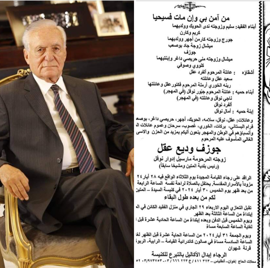 صدر عن مجلس بلدية المتين : حداداً على وفاة الاستاذ جوزف عقل وعربوناً و تقديراً لما قدَمه للمتين و مشيخا و لجميع الاهالي من جهود و تضحيات خلال ترؤسه للمجلس البلدي ستكون البلدية مقفلة نهار الخميس30 ايار2024 لكم من بعده طول البقاء
