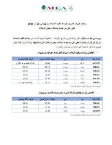أعلنت شركة طيران الشرق الأوسط – الخطوط الجوية اللبنانية، أنّ رحلاتها للفترة الممتدة من 22 الى 25 آب 2024 ستبقى على مواعيدها بإستثناء بعض الرحلات التي تم تعديلها، وذلك لأسباب تقنية تتعلق بتوزيع المخاطر التأمينية على الطائرات بين لبنان والخارج.