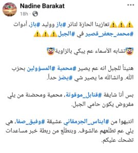 كتبت الناشطة نادين بركات عبر صفحتها على فيسبوك :