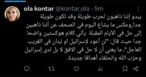 كتبت الإعلامية د.عُلا القنطار عبر حسابها على منصة “أكس”: يبدو أنّنا ذاهبون لحرب طويلة وقد تكون طويلة جدا.. وعكس ما يشاع اليوم في الصحف عن أنه ثمة حلول في الأيام المقبلة، يأتي كلام هوكستين واضحا جدا حيث قال: “لن أعود لإسرائيل او لبنان في القريب العاجل”، ما يعني أن لا حل في الافق لا بل لدى إسرائيل وحزب الله والحلفاء أهداف جديدة.