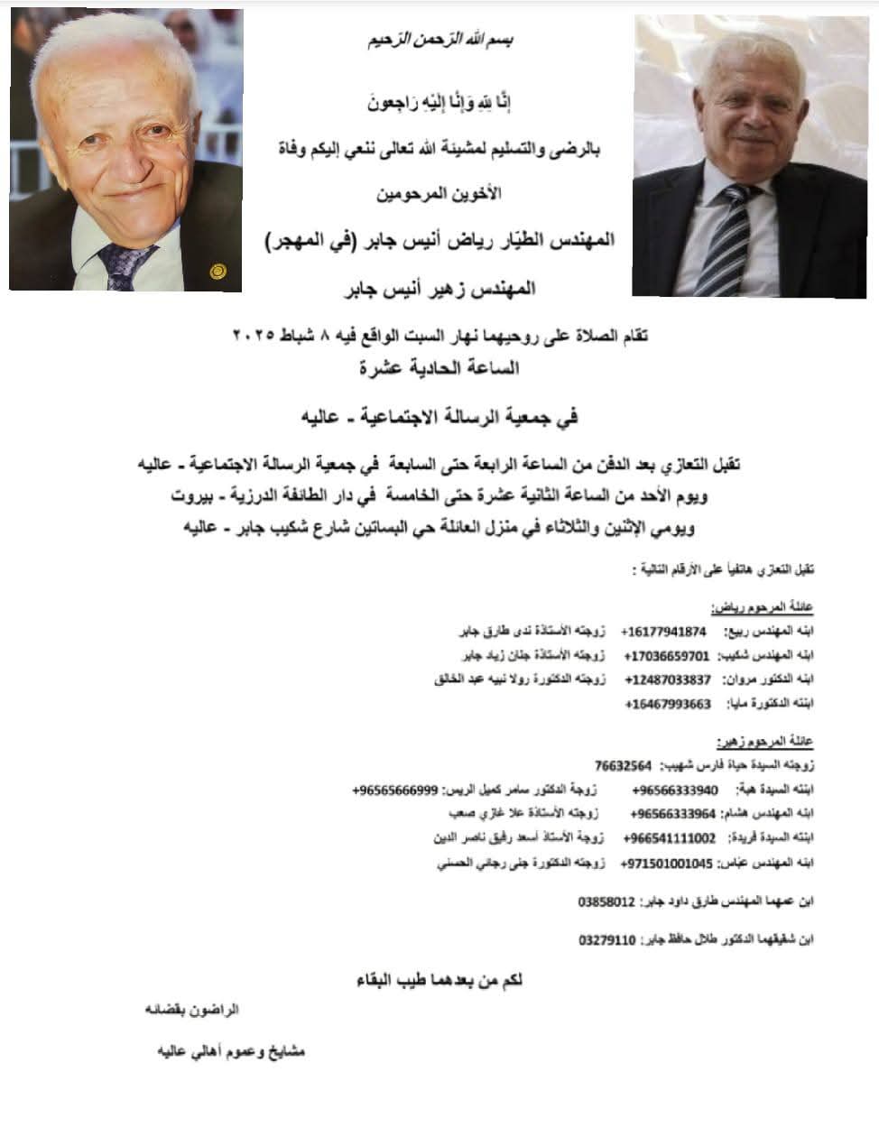 اليوم، ومع رحيل الكابتن رياض جابر والمهندس زهير جابر، تخسر عاليه رجلين كانا مثالًا للالتزام والاحتراف والإنسانية. الكابتن رياض، الذي خاض رحلته في عالم الطيران ببراعة ومسؤولية، والمهندس زهير، الذي ترك بصمة واضحة في مجاله الهندسي والاجتماعي. برحيلهما، تنطفئ شمعتان من بيتٍ لطالما كان منارة للعلم والثقافة والمواقف المشرفة.