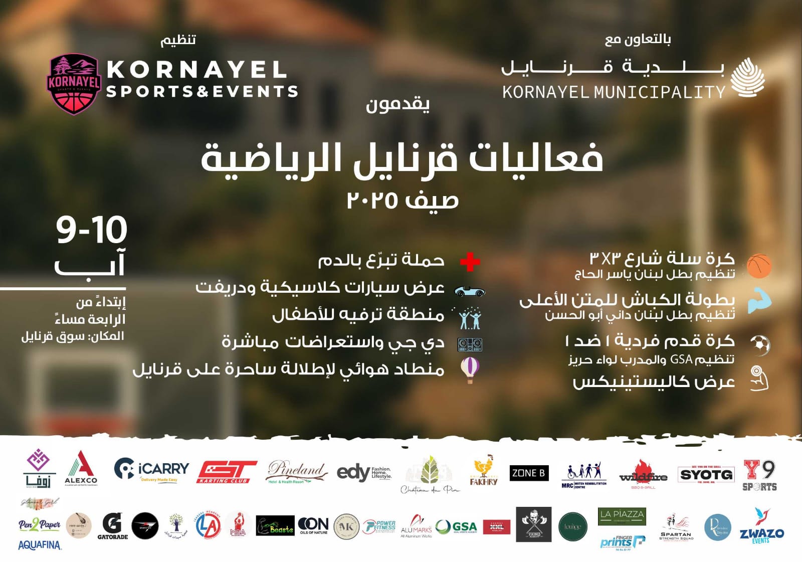 في مبادرة مميزة تعكس روح التعاون والانفتاح، تنظم *بلدية قرنايل* بالتعاون مع *Kornayel Sports & Events* فعاليات *”قرنايل الرياضية – صيف 2025″* على مدى يومين، في *9 و10 آب*، في *سوق قرنايل* ابتداءً من الساعة الرابعة عصراً.