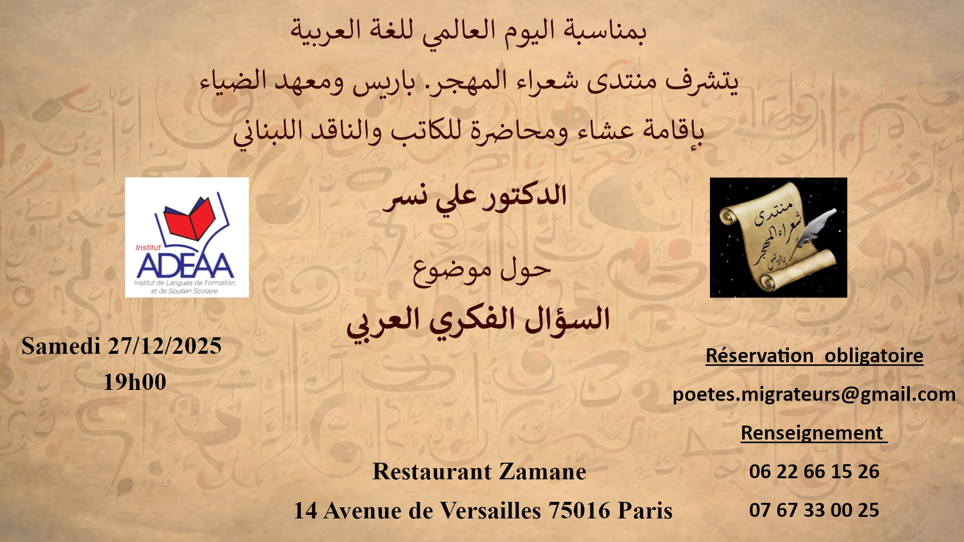 بمبادرة من منتدى شعراء المهجر – باريس وبالتعاون مع معهد الضياء (ADEAA)*، يُنظّم عشاء ثقافي ومحاضرة مميزة للدكتور *علي نسر*، الكاتب والناقد اللبناني المعروف، تحت عنوان: *”السؤال الفكري العربي”، وذلك يوم السبت 27 كانون الأول 2025* عند الساعة *السابعة مساءً (19:00) في مطعم Zamane – 14 Avenue de Versailles – 75016 Paris*.