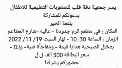 تدعوكم جمعية دقة قلب للصعوبات التعليمية للأطفال للمشاركة “بلقمة الخير” في مطعم كرم جدودنا_عاليه_شارع المطاعم وذلك يوم السبت 19/11/2022الساعة 10:30…